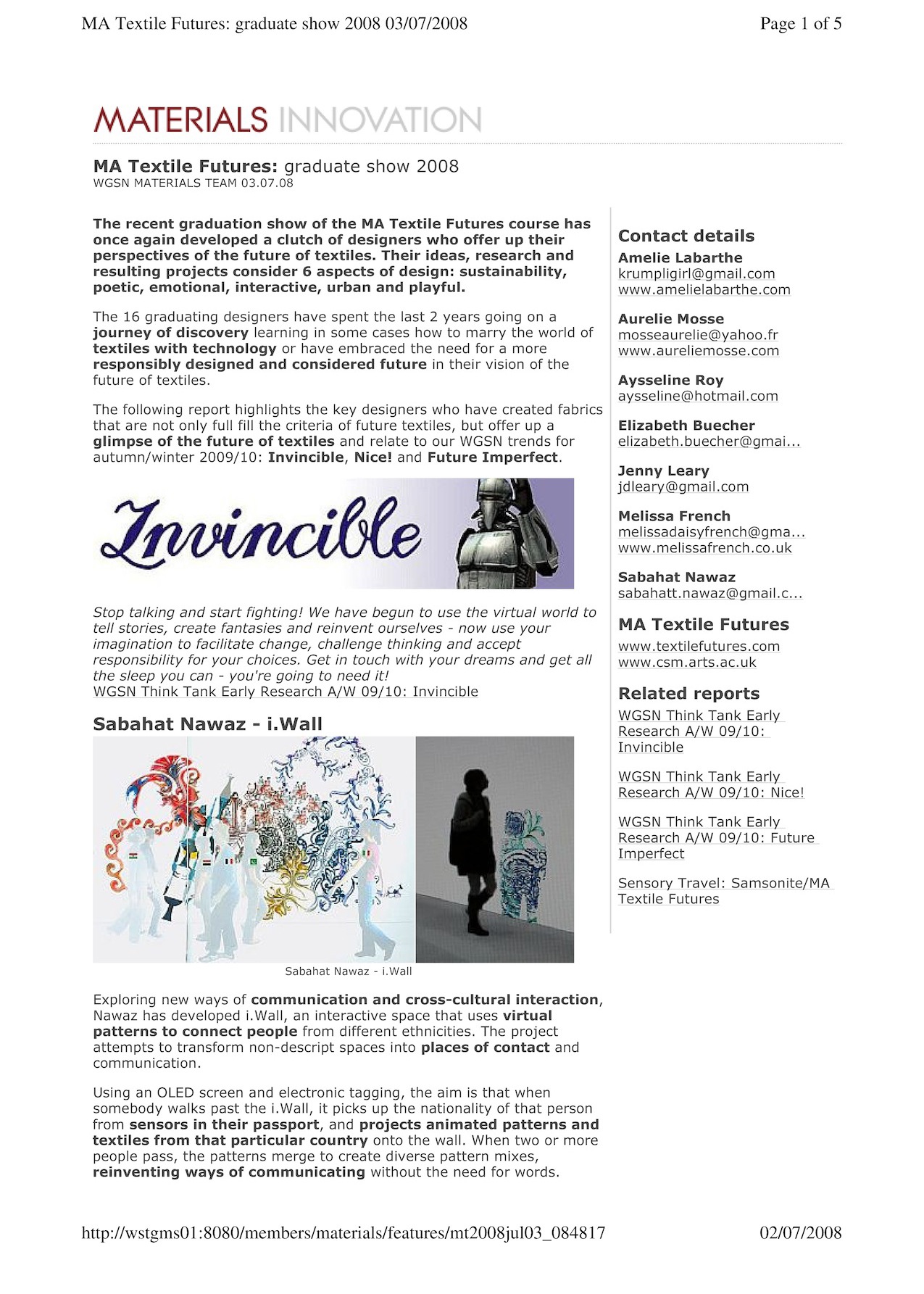 WGSN [trend forecasting services], MA Textile Futures graduate show review, 2008, London: